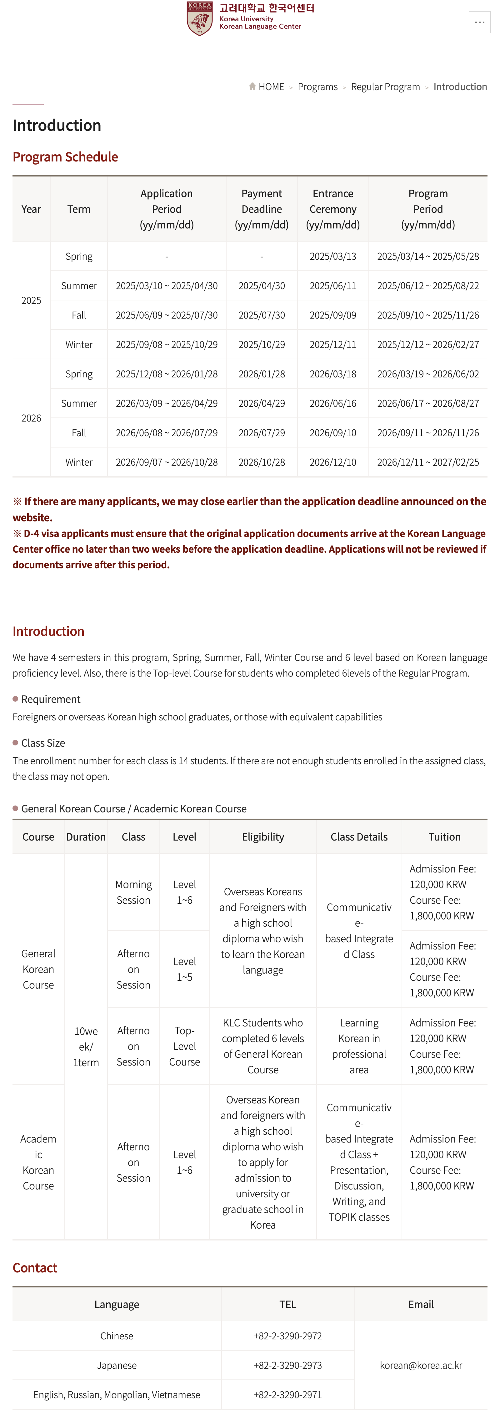 고려대학교 Korea University Korean Language Regular Course 2025/2026